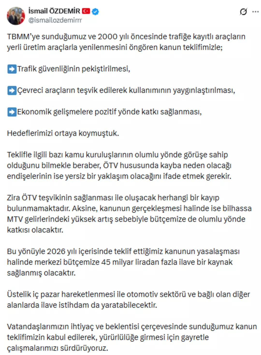 Açıklamanın en dikkat çeken başlığı ise Motorlu Taşıtlar Vergisi oldu. Özdemir, teklifin yasalaşması halinde MTV gelirlerinde 45 milyar TL’yi aşan bir artış öngörüldüğünü söyledi.